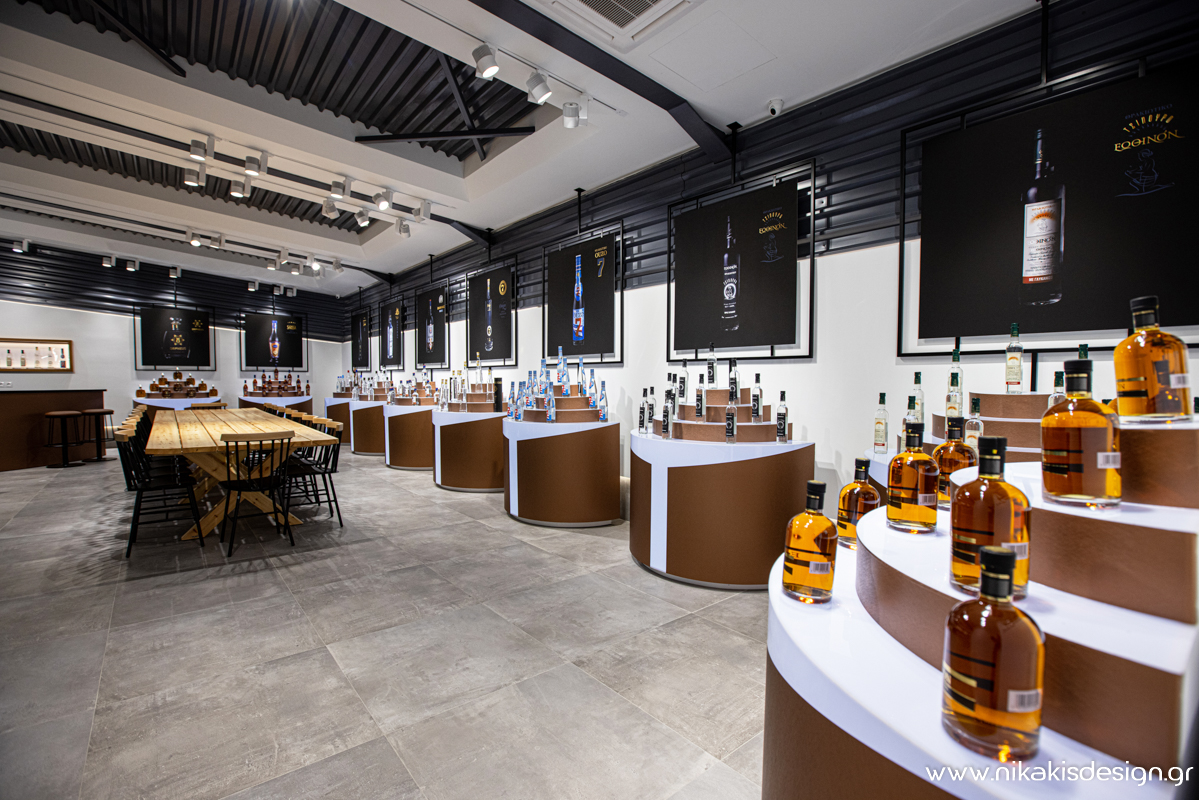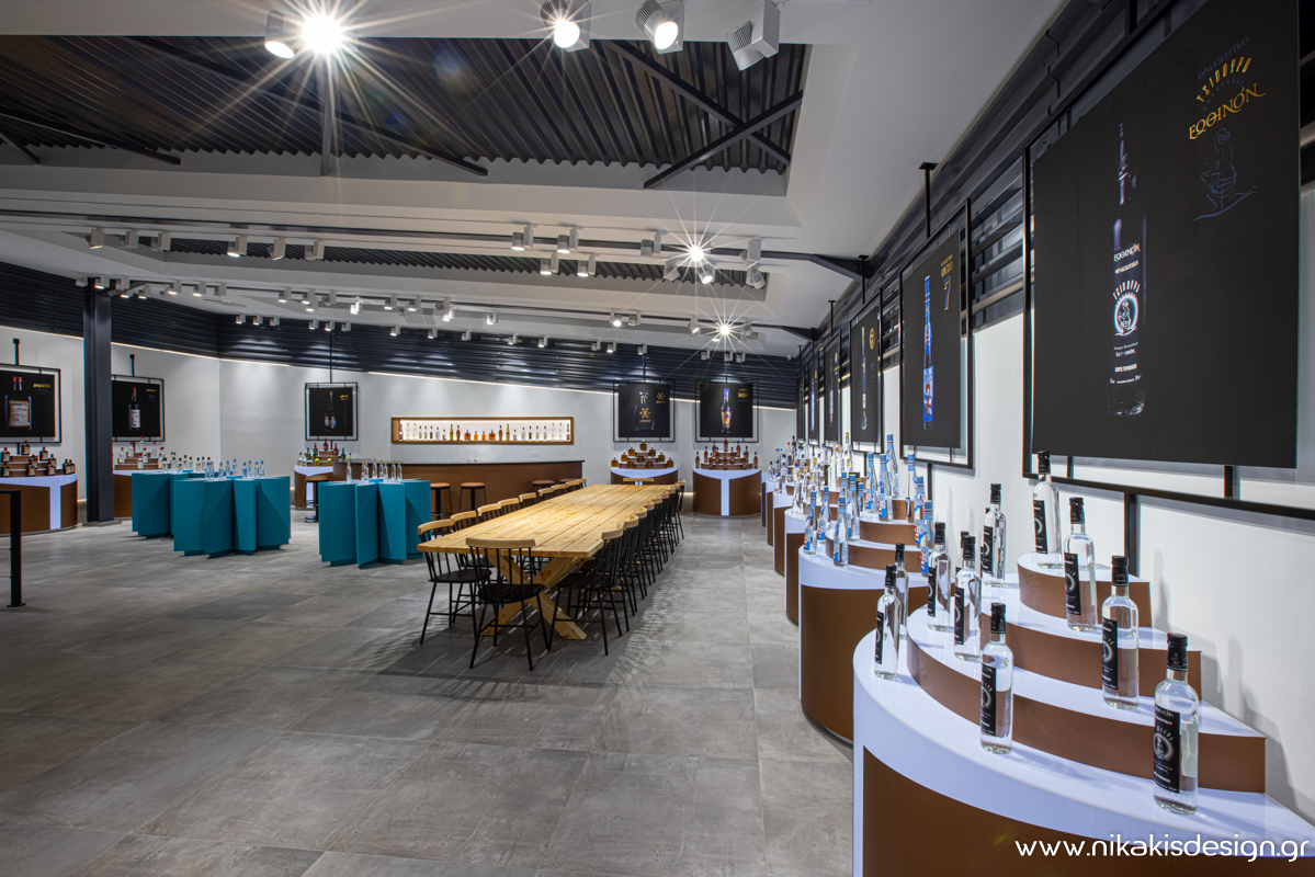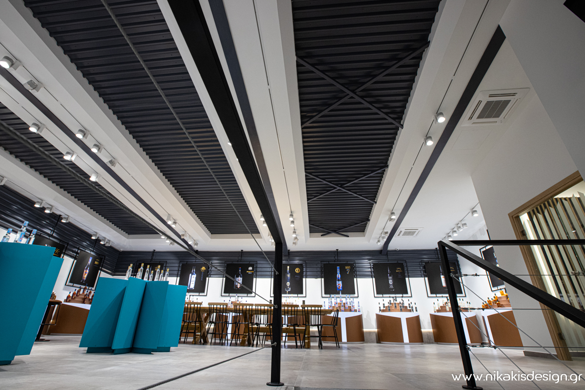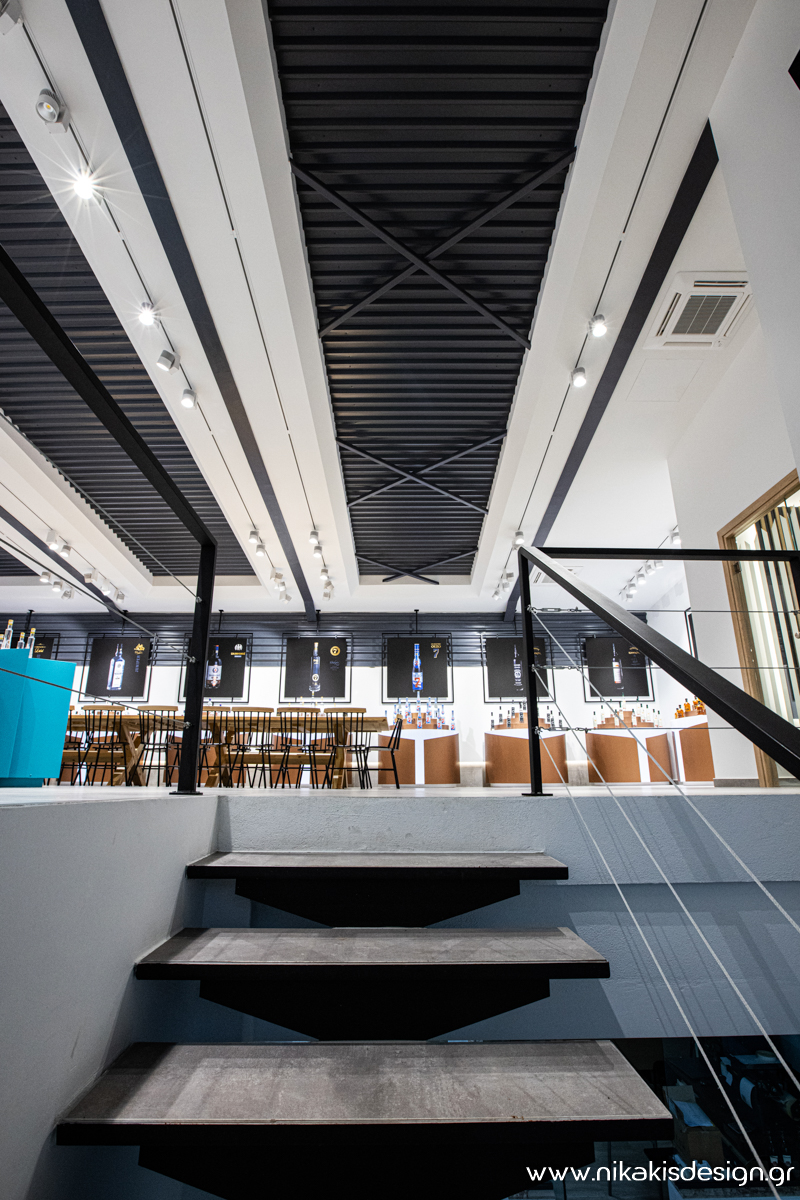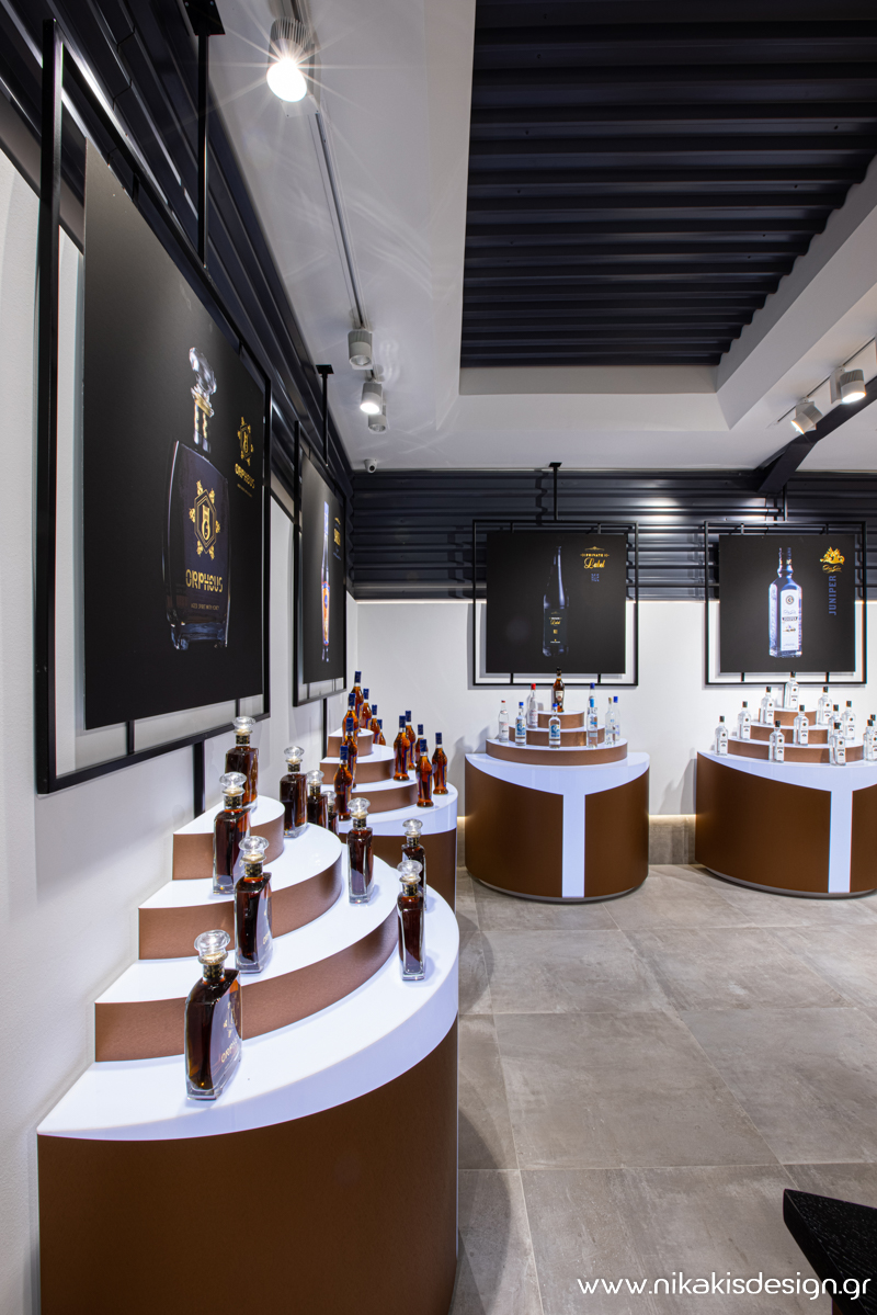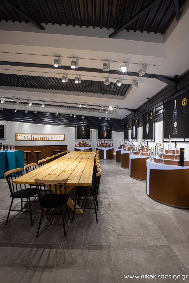 Περιγραφή: Στη βιομηχανική περιοχή της πόλης της Κομοτηνής ολοκληρώθηκε το νέο project της καθ’ ύψος επέκτασης του κτιρίου της Ποτοποιίας-Οινοποιίας Θράκης καθώς και της ανάπλασης της κύριας όψης του. Στον νεόδμητο 1ο όροφο ήταν απαραίτητη η δημιουργία ενός showroom για την έκθεση αλλά και την δοκιμή από τους νέους πελάτες της επιχείρησης των προιόντων της ποτοποιίας, αλλά και η δημιουργία ενός οργνωμένου meetingroom για τις απαραίτητες συναντήσεις μεταξύ των μετόχων αλλά και των νέων πελατών. Με βάση λοιπόν τον χαρακτήρα της ευρύτερης περιοχής κυριάρχησε στο σχεδιασμό το βιομηχανικό designτόσο στην εσωτερική διαμόρφωση του νέου ορόφου όσο και στο νέο περίβλημα του κτιρίου. Στο εσωτερικό πρωταγωνιστικό ρόλο έχει το μέταλλο, με κυρίαρχη τη μαύρη λαμαρίνα, καθώς και οι υφές του σκυροδέματος και του φυσικού ξύλου. Κομβική θέση κατέχει και ο σχεδιασμός του φωτισμού στο χώρο, ο οποίος συνδυάζοντας άμεσες και ισχυρές πηγές φωτός από τις οροφές με διάχυτους εσωτερικούς φωτισμούς από τα ειδικά σχεδιασμένα εκθετήρια των προϊόντων, πετυχαίνει ένα ιδανικό αποτέλεσμα για την ανάδειξη των προιόντων. Στο εξωτερικό οι μεγάλες αυστηρές επιφάνειες μεταλλικής επένδυσης ενισχύουν τον βιομηχανικό χαρακτήρα του κτιρίου, προσδίδοντάς του ταυτόχρονα μια ιδιαίτερη δυναμική που το κάνει να δεσπόζει στο περιβάλλον του.