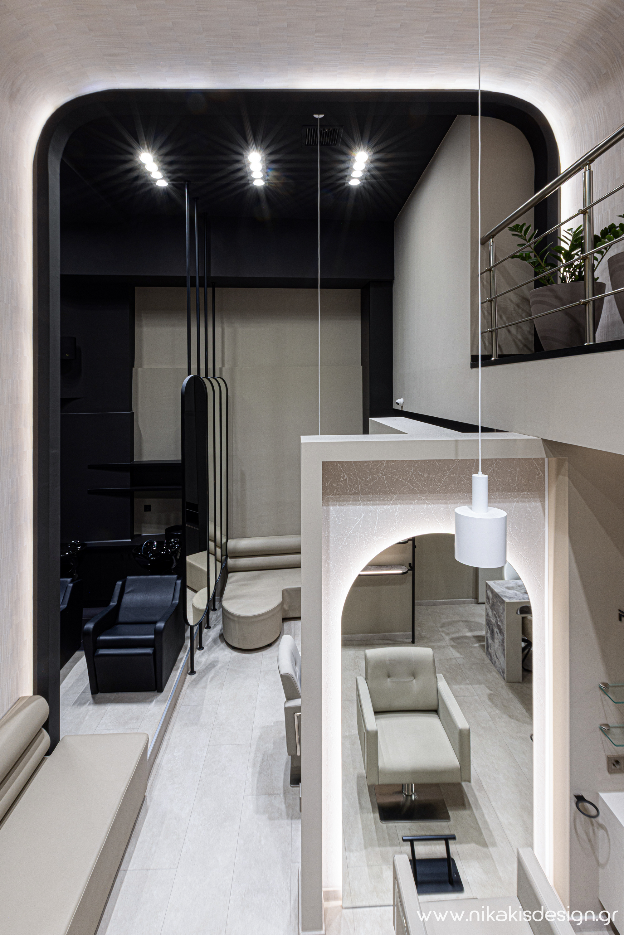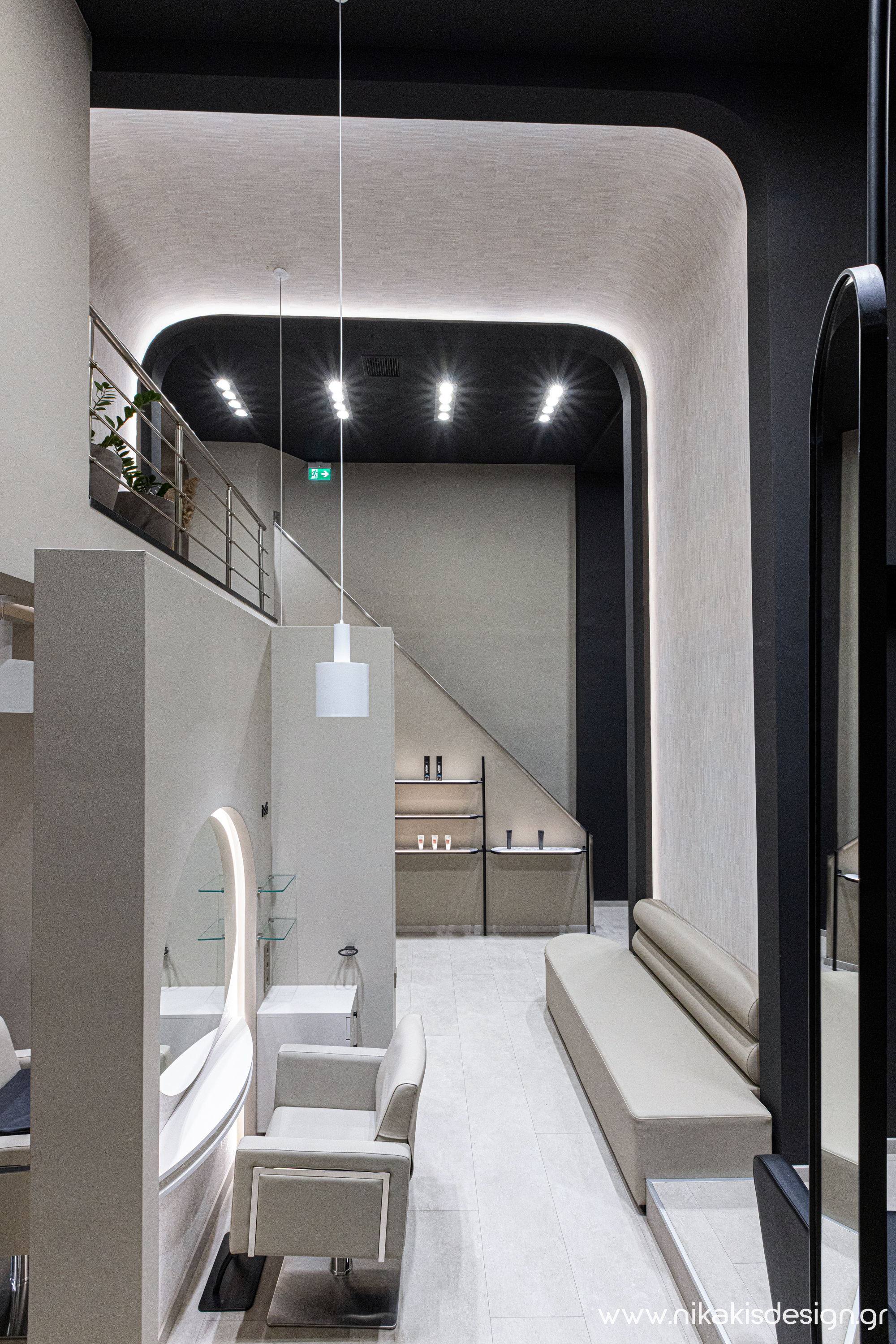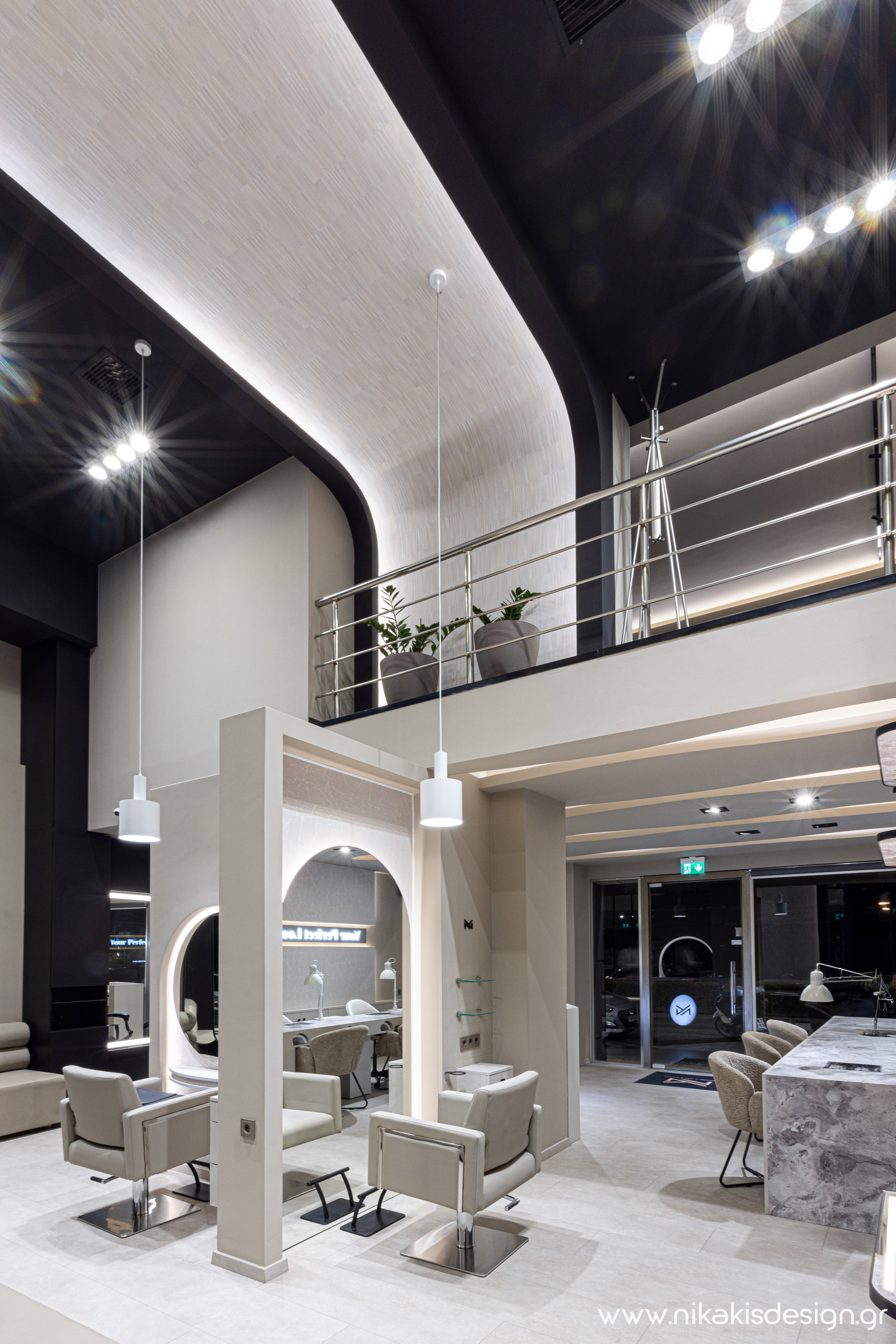 Περιγραφή: Η ανάγκη μιας από τις πιο δραστήριες επιχειρήσεις αισθητικής της Κομοτηνής για αύξηση του λειτουργικού της χώρου, οδήγησε στην δημιουργία ενός νέου σύγχρονου χώρου με μία πολυεπίπεδη εσωτερική διαρρύθμιση που εξυπηρετεί το μεγάλο εύρος υπηρεσιών της επιχείρησης. Βασική έμπνευση του συνολικού σχεδιασμού ήταν η αναφορά στο δίπολο γυναίκα - άνδρας που οδήγησε στο πάντρεμα της μίνιμαλ κομψότητας και του δυναμικού σχεδιασμού, σε ένα ισορροπημένο αισθητικό αποτέλεσμα, που εκφράζεται τόσο στο εσωτερικό όσο και στην όψη προς την πόλη. Ο προσεκτικά σχεδιασμένος φωτισμός εξυπηρετεί όλες τις λειτουργικές ανάγκες και ενισχύει δυναμικά την συνολική ατμόσφαιρα του χώρου, δημιουργώντας την αίσθηση της διακριτικής πολυτέλειας.