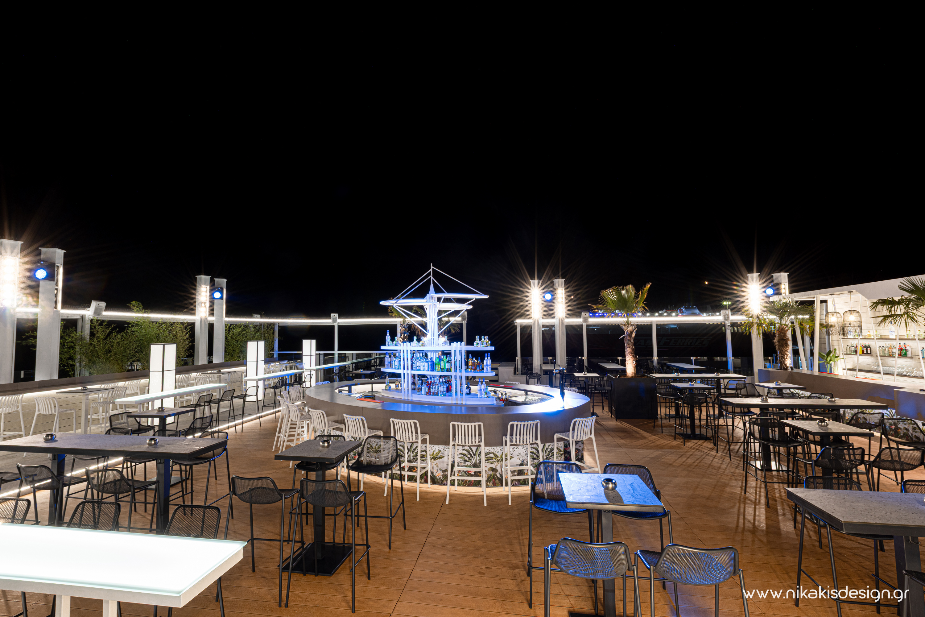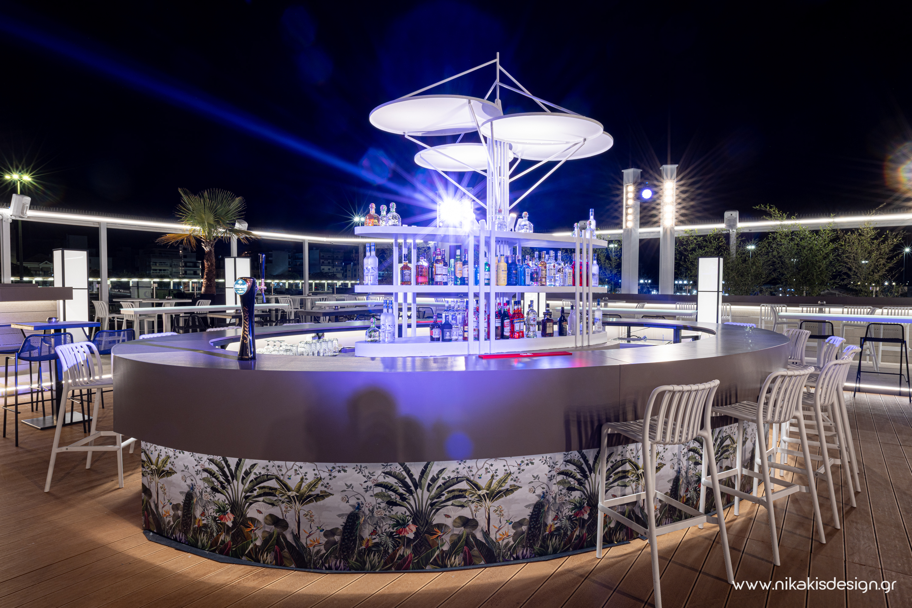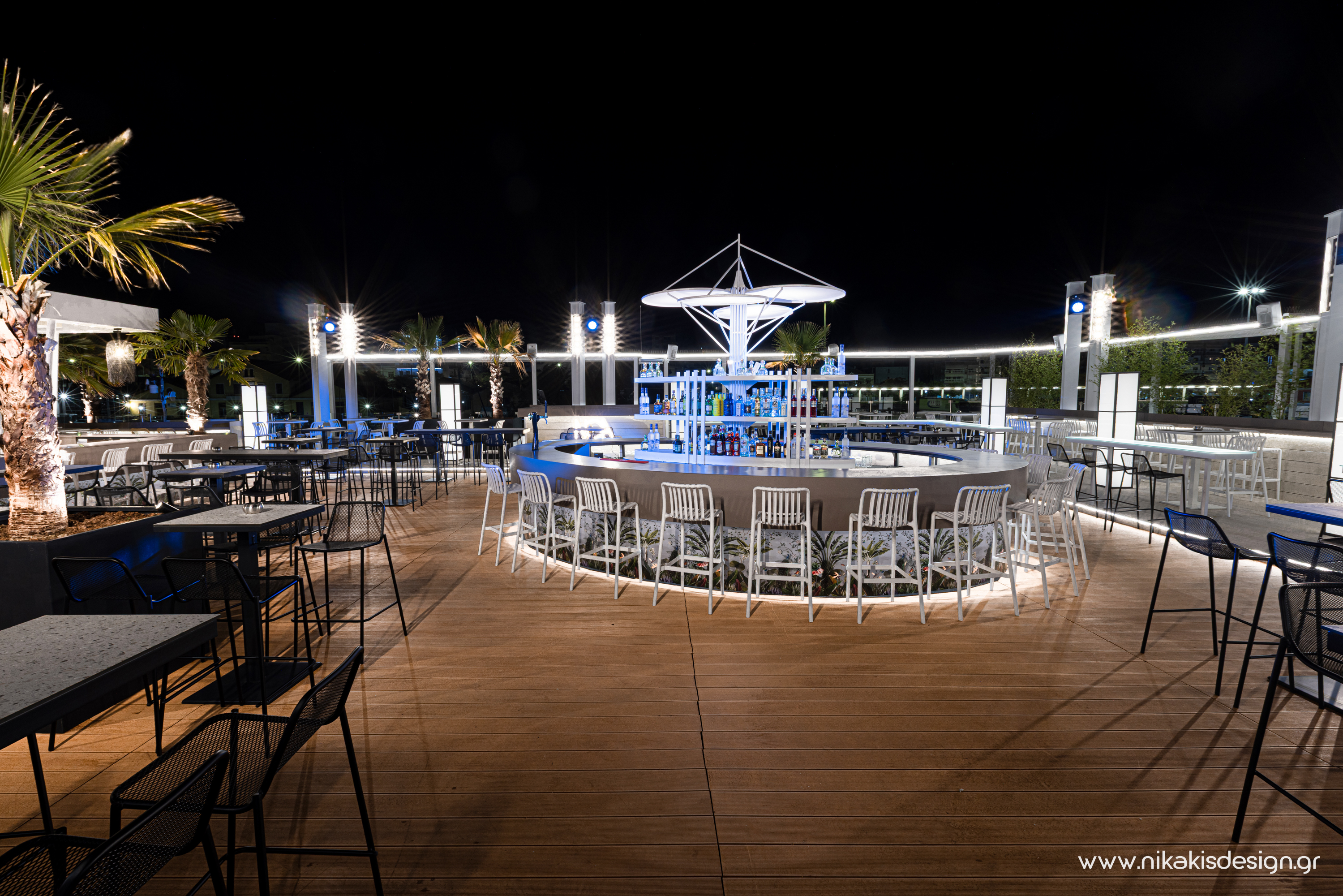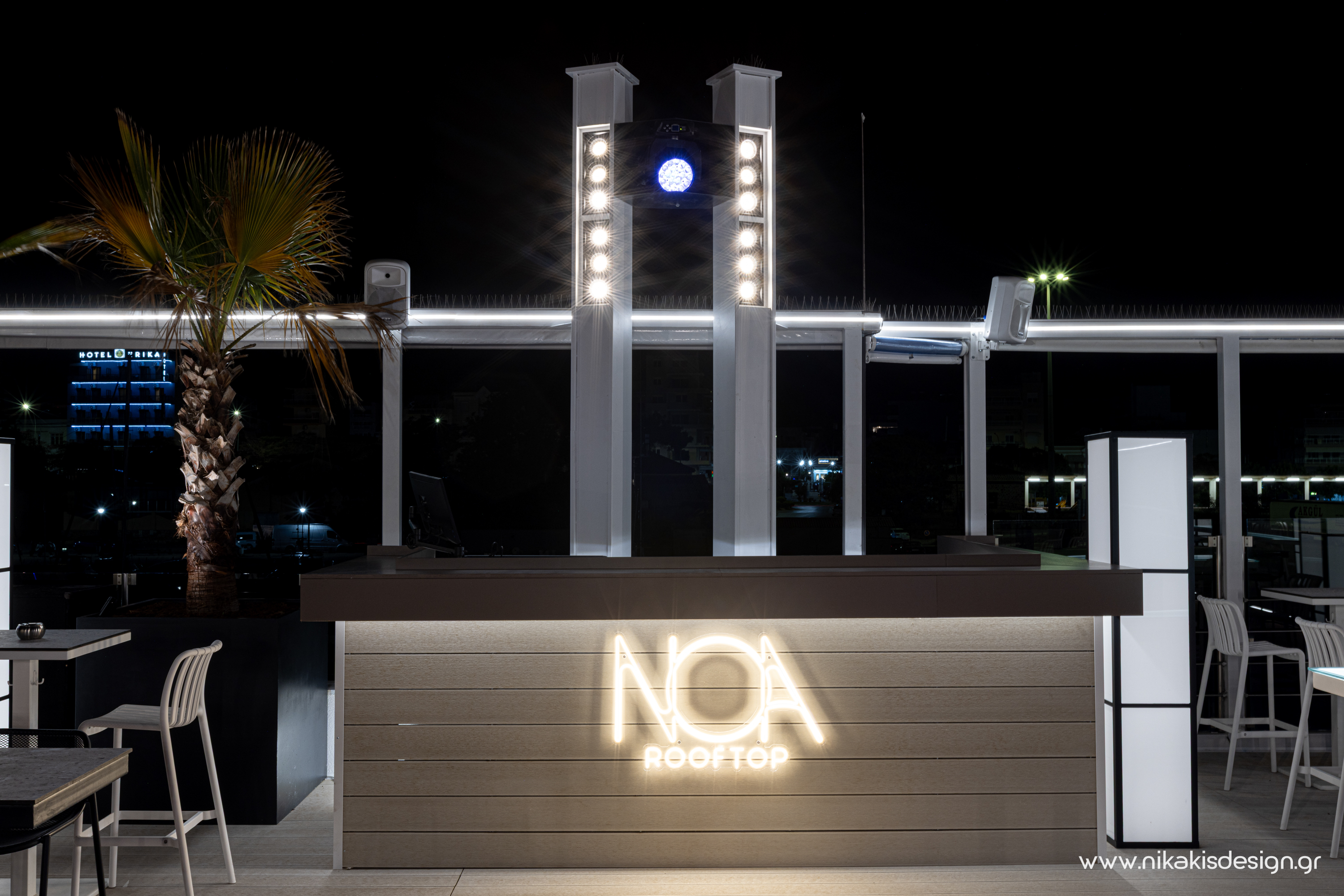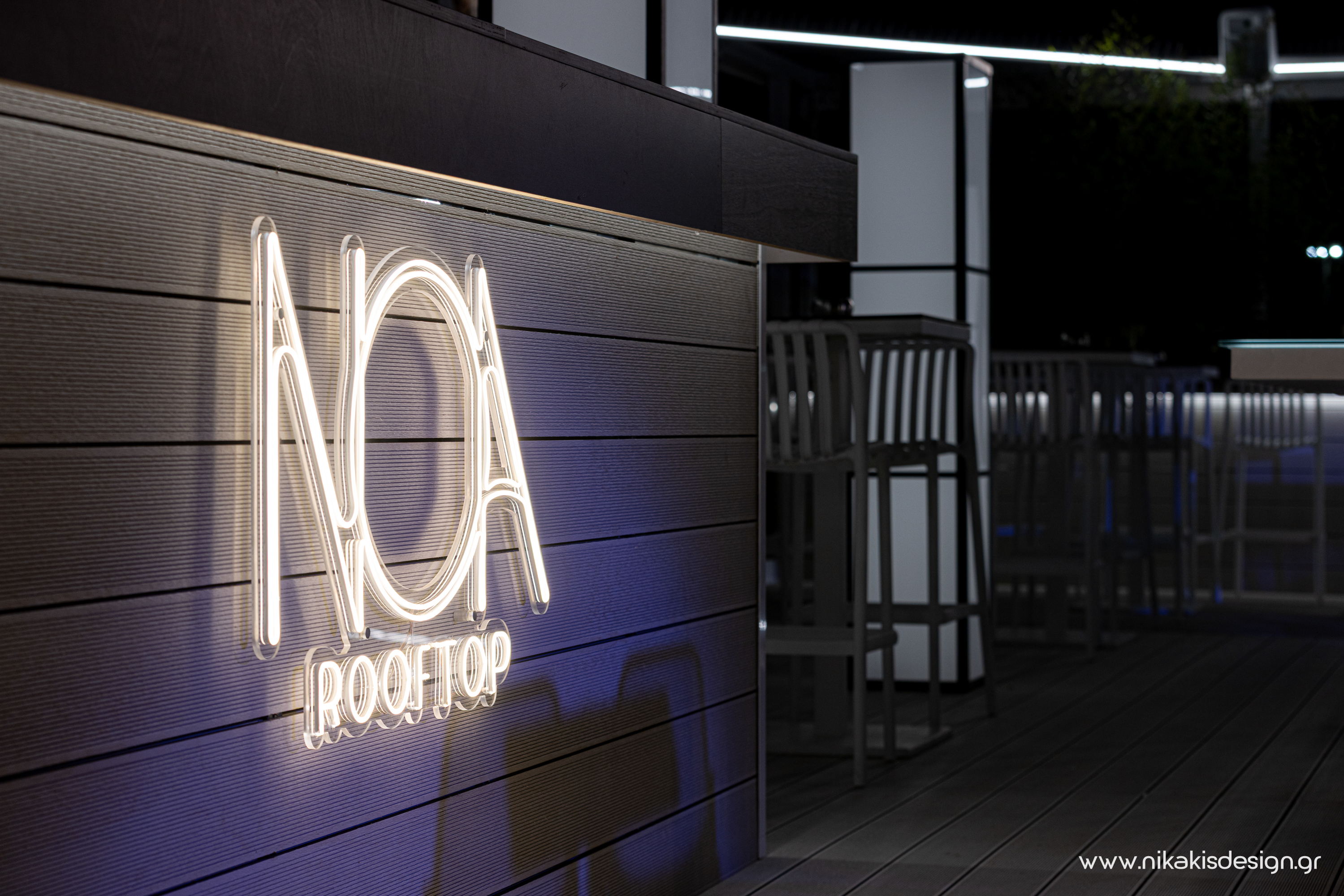 Περιγραφή: Πρόσφατα ολοκληρώθηκε μια ακόμη συνεργασία με το εμβληματικό café bar ΝΟΑ της Αλεξανδρούπολης με τον σχεδιασμό και υλοποίηση του νέου καλοκαιρινού Rooftop στο δώμα της επιχείρησης. Σημείο αναφοράς στον σχεδιασμό αποτελεί το μεγάλο οβάλ bar που δεσπόζει στο κέντρο του χώρου και οργανώνει γύρω του όλη την κίνηση των επισκεπτών αλλά και το μεγάλο γωνιακό bar που αποτελεί ένα νοητό όριο και στρέφει την οπτική του χώρου προς τη θάλασσα που περιβάλλει και ενισχύει την καλοκαιρινή ατμόσφαιρά του. Η στρατηγική τοποθέτηση φυτών προσθέτει μια τροπική νότα και η εγκατάσταση ποικίλων φωτιστικών σωμάτων δίνουν τη δυνατότητα έντονου αλλά και πιο ατμοσφαιρικού φωτισμού του χώρου με βάση τις εκάστοτε απαιτήσεις.
