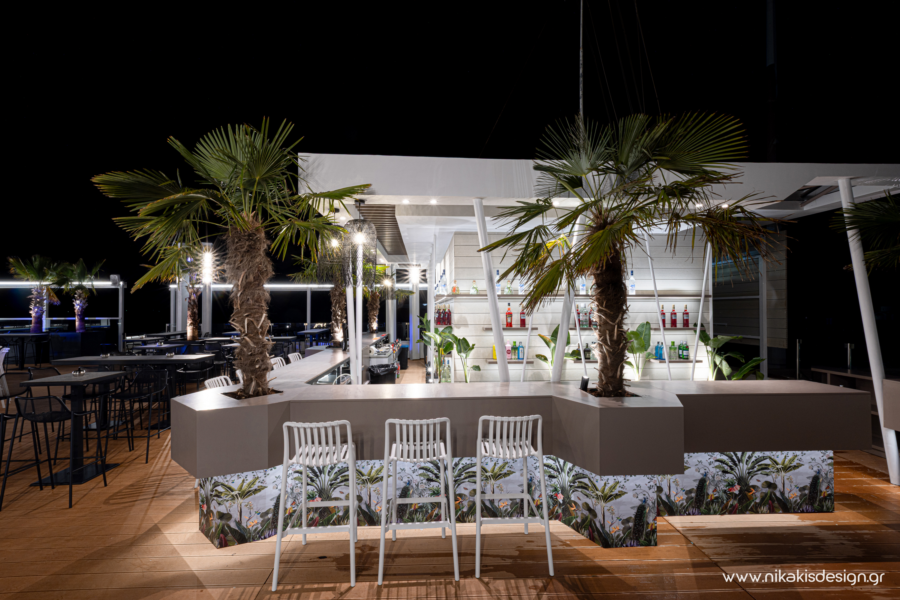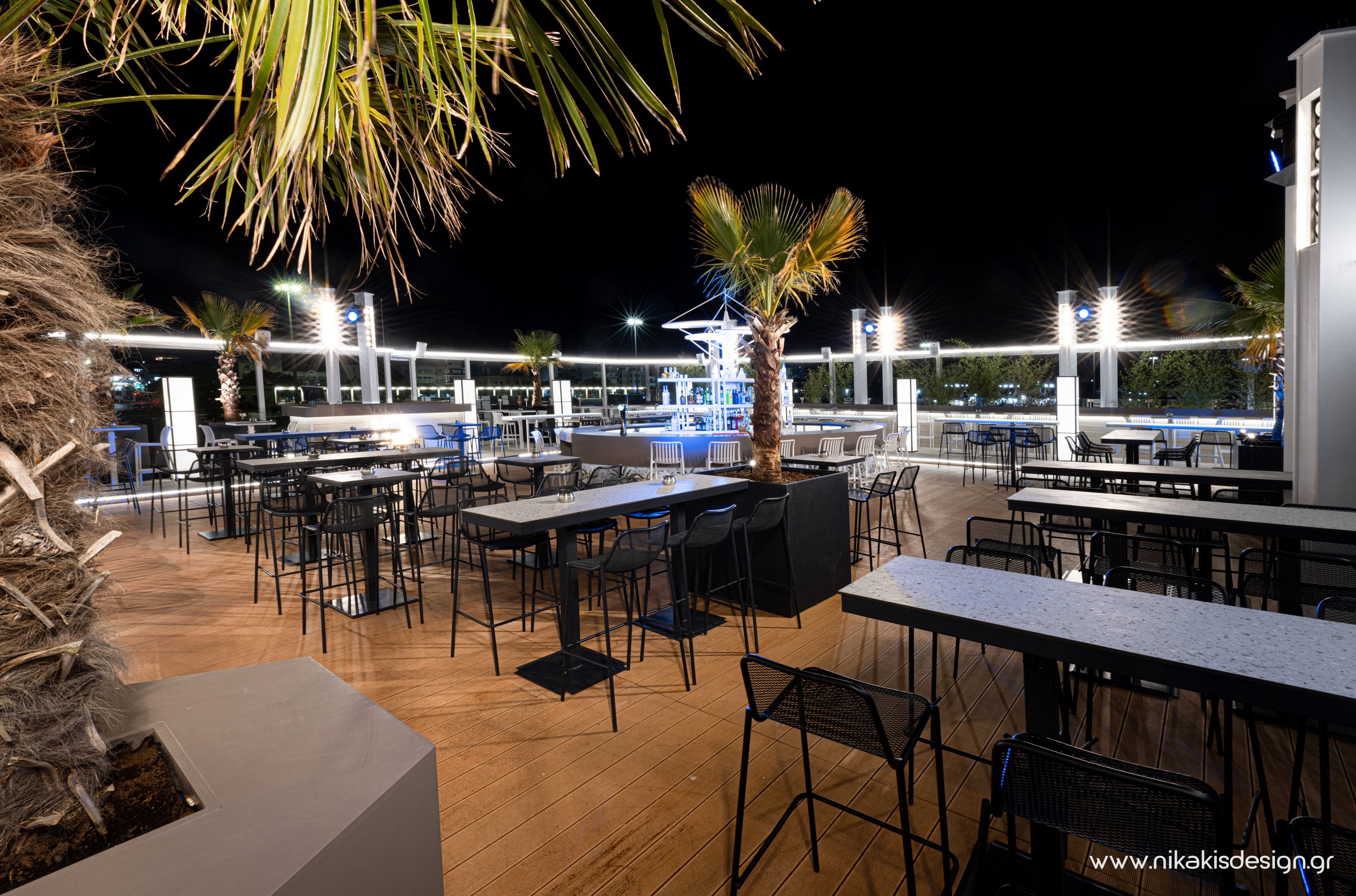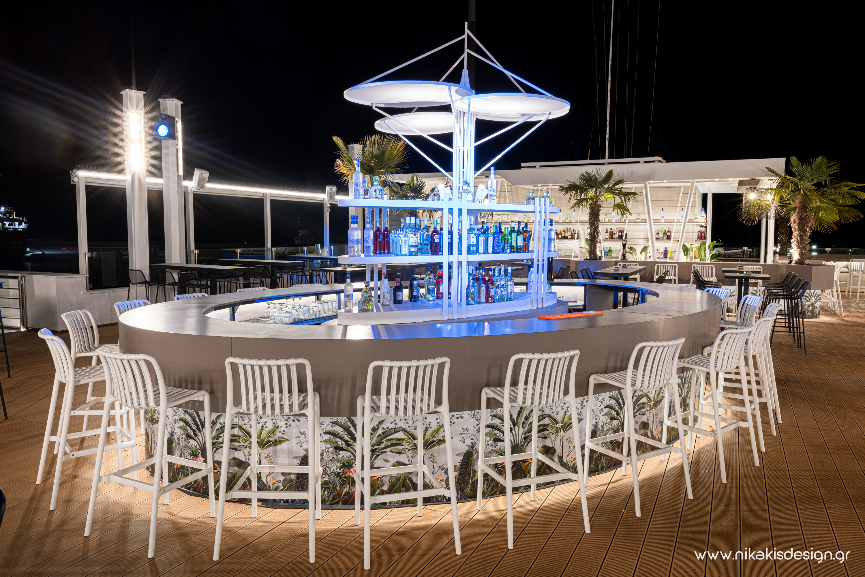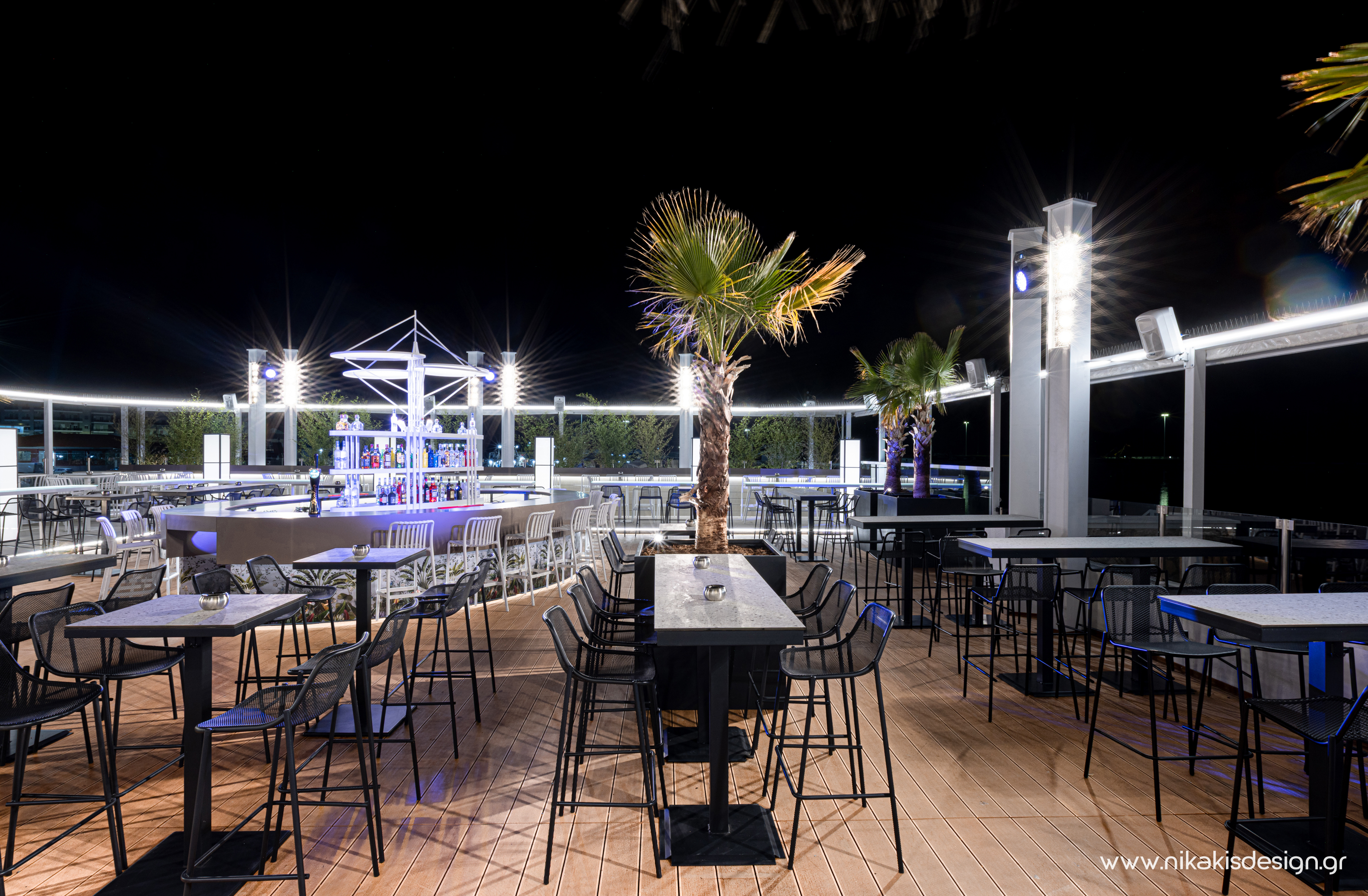 Περιγραφή: Πρόσφατα ολοκληρώθηκε μια ακόμη συνεργασία με το εμβληματικό café bar ΝΟΑ της Αλεξανδρούπολης με τον σχεδιασμό και υλοποίηση του νέου καλοκαιρινού Rooftop στο δώμα της επιχείρησης. Σημείο αναφοράς στον σχεδιασμό αποτελεί το μεγάλο οβάλ bar που δεσπόζει στο κέντρο του χώρου και οργανώνει γύρω του όλη την κίνηση των επισκεπτών αλλά και το μεγάλο γωνιακό bar που αποτελεί ένα νοητό όριο και στρέφει την οπτική του χώρου προς τη θάλασσα που περιβάλλει και ενισχύει την καλοκαιρινή ατμόσφαιρά του. Η στρατηγική τοποθέτηση φυτών προσθέτει μια τροπική νότα και η εγκατάσταση ποικίλων φωτιστικών σωμάτων δίνουν τη δυνατότητα έντονου αλλά και πιο ατμοσφαιρικού φωτισμού του χώρου με βάση τις εκάστοτε απαιτήσεις.