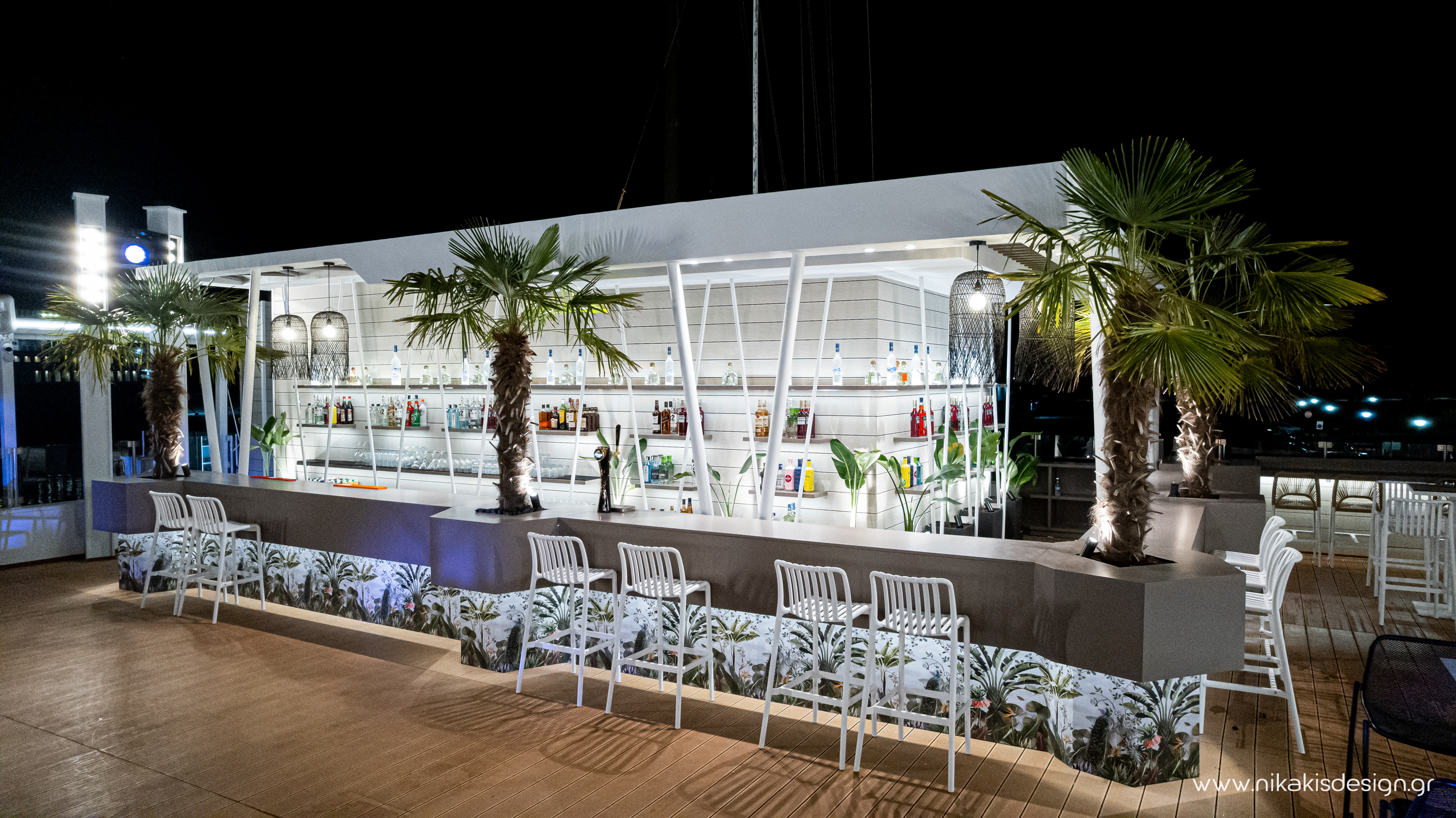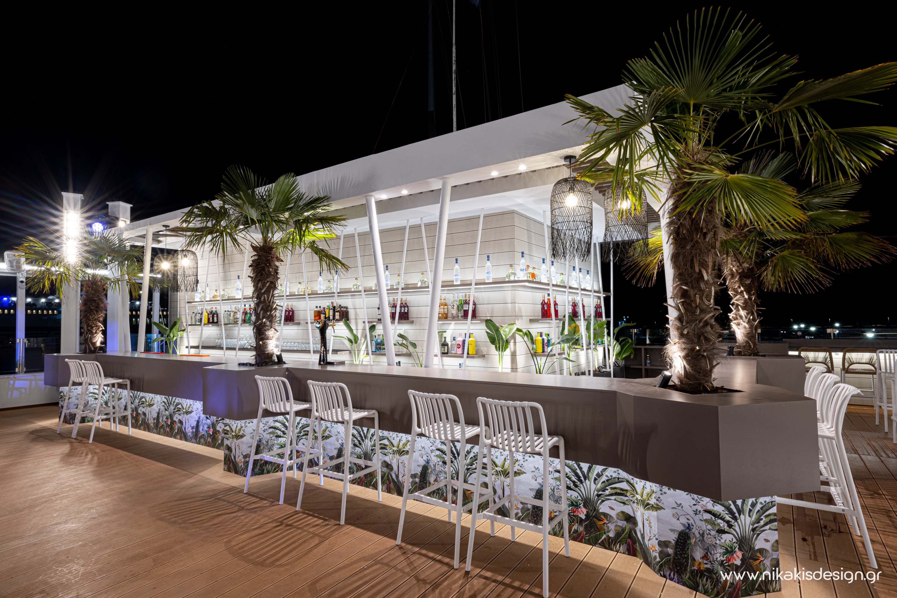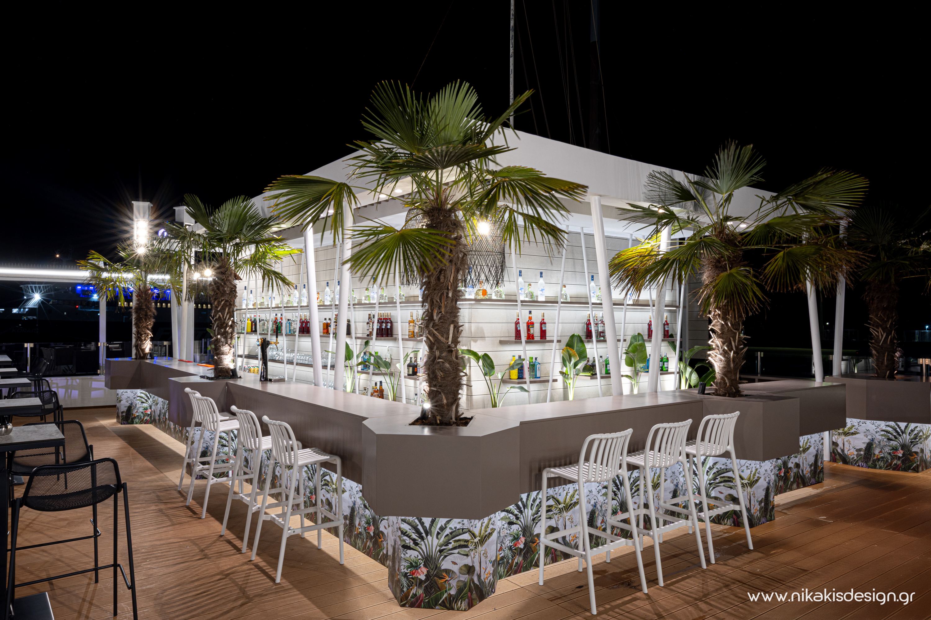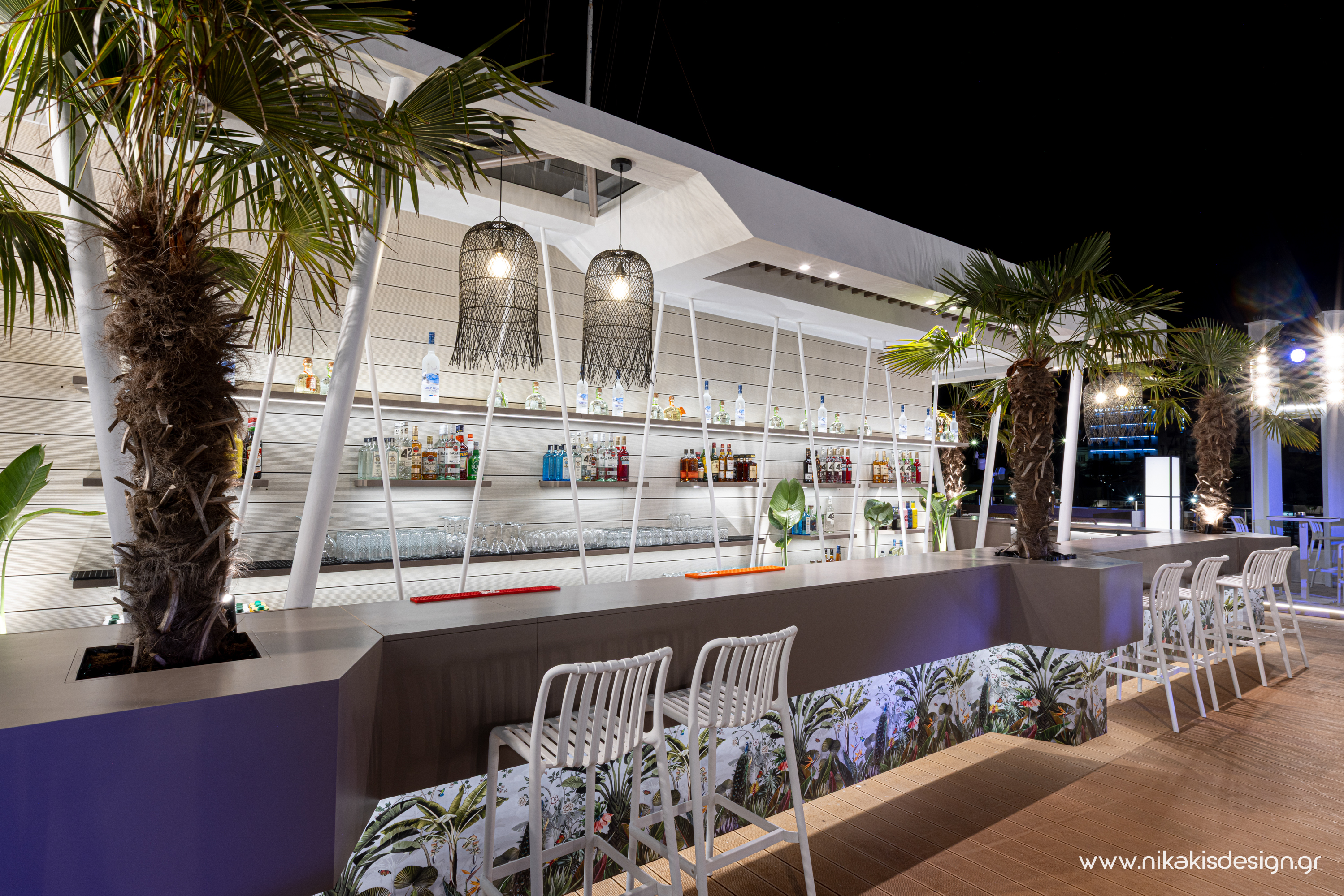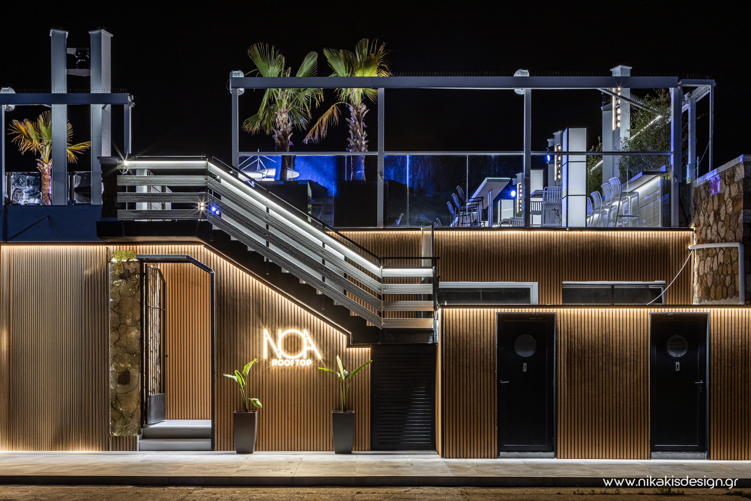 Περιγραφή: Πρόσφατα ολοκληρώθηκε μια ακόμη συνεργασία με το εμβληματικό café bar ΝΟΑ της Αλεξανδρούπολης με τον σχεδιασμό και υλοποίηση του νέου καλοκαιρινού Rooftop στο δώμα της επιχείρησης. Σημείο αναφοράς στον σχεδιασμό αποτελεί το μεγάλο οβάλ bar που δεσπόζει στο κέντρο του χώρου και οργανώνει γύρω του όλη την κίνηση των επισκεπτών αλλά και το μεγάλο γωνιακό bar που αποτελεί ένα νοητό όριο και στρέφει την οπτική του χώρου προς τη θάλασσα που περιβάλλει και ενισχύει την καλοκαιρινή ατμόσφαιρά του. Η στρατηγική τοποθέτηση φυτών προσθέτει μια τροπική νότα και η εγκατάσταση ποικίλων φωτιστικών σωμάτων δίνουν τη δυνατότητα έντονου αλλά και πιο ατμοσφαιρικού φωτισμού του χώρου με βάση τις εκάστοτε απαιτήσεις.