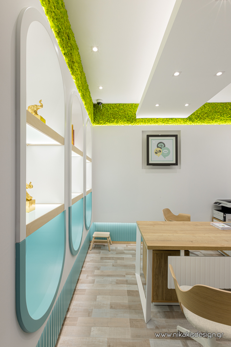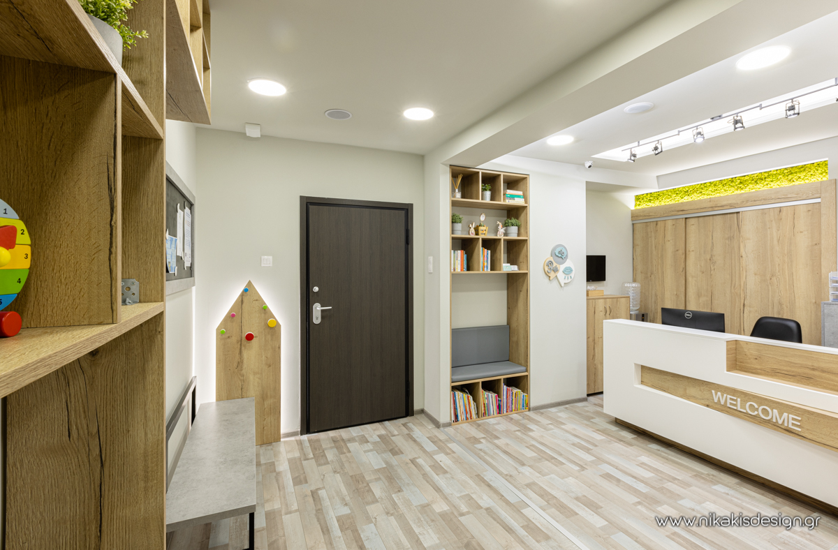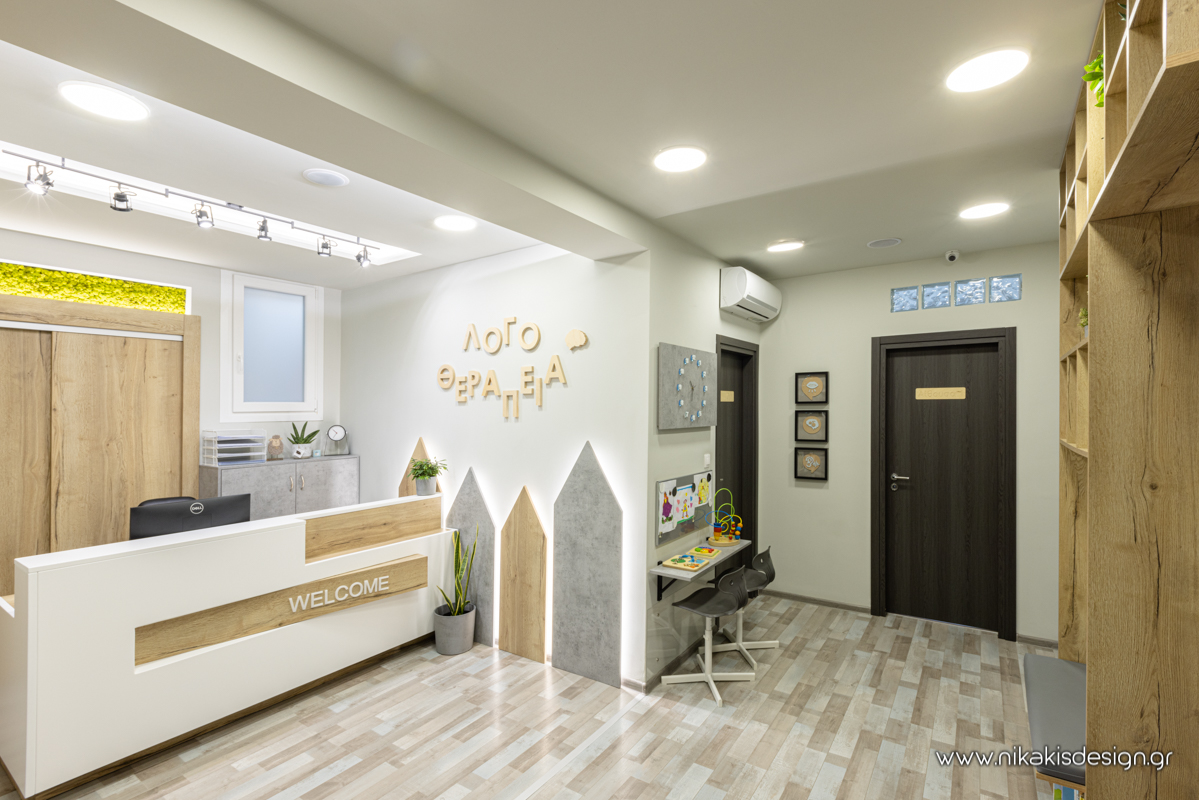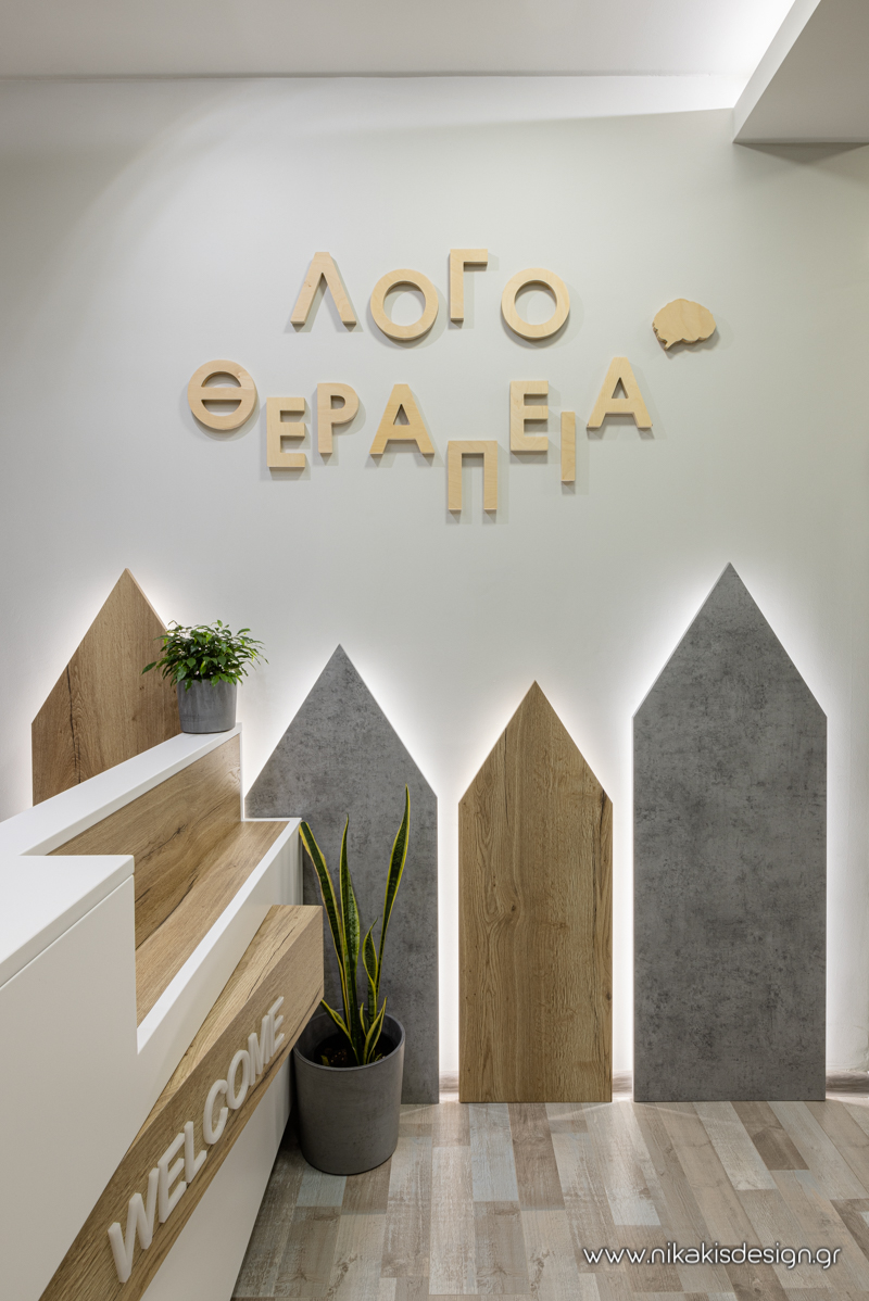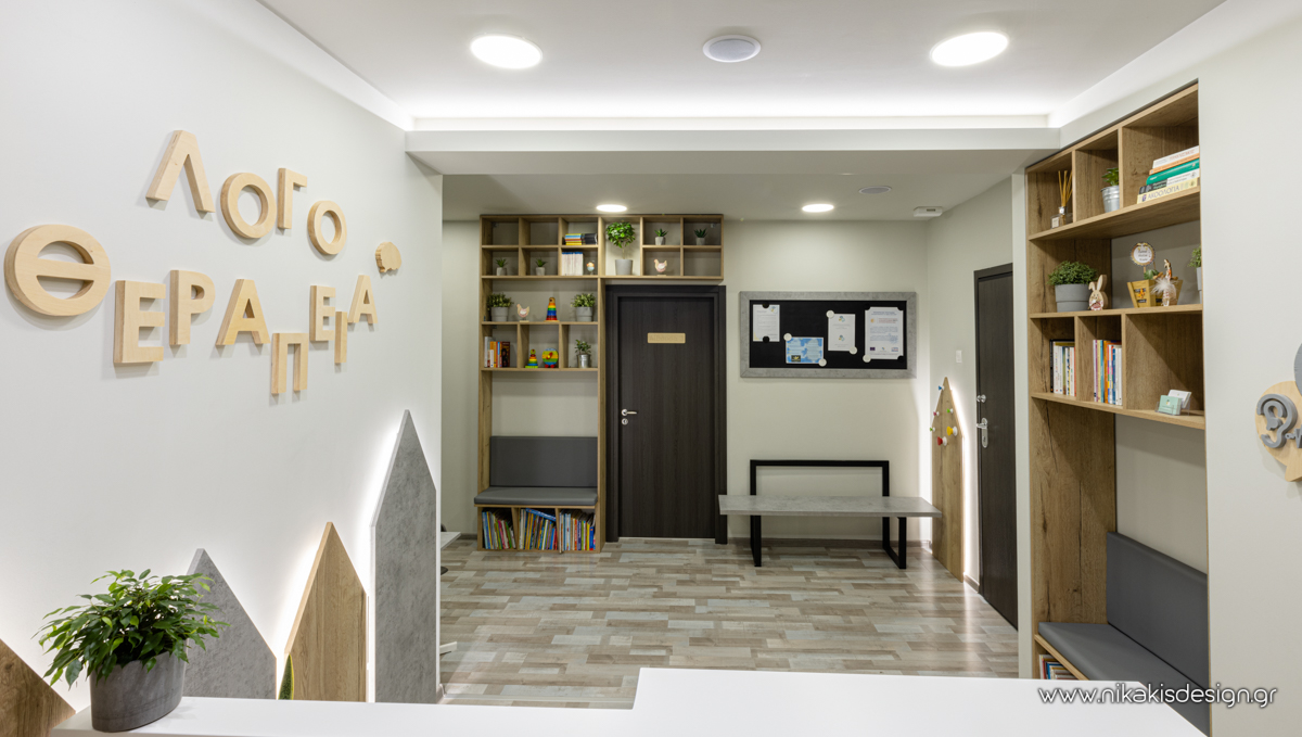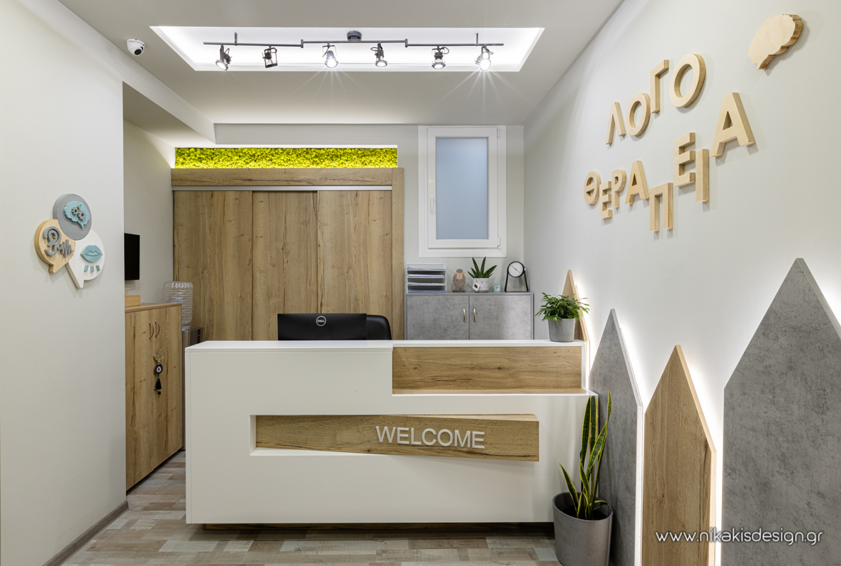 Περιγραφή: Το Κέντρο Λογοθεραπείας Φραγκοπούλου Χριστίνα είναι ένα από τα πιο πρόσφατα project μας στην πόλη της Κομοτηνής. Ο χώρος σχεδιάστηκε με γνώμονα το κοινό των μικρών επισκεπτών που επρόκειτο να φιλοξενήσει, ώστε να είναι ευχάριστος και διασκεδαστικός. Έτσι επιλέχθηκε το λευκό ως ο βασικός καμβάς, πάνω στον οποίο χρησιμοποιήθηκε το ξύλο στη φυσική του απόχρωση αλλά και σε επιλεγμένους φωτεινούς χρωματισμούς. Η χρήση μορφών σπιτιών, βουνών και σύννεφων και η παρουσία κατακόρυφων φυτών εξάπτουν την παιδική φαντασία συμβάλλοντας έτσι στην ευχάριστη διαμονή των παιδιών στο χώρο. Τέλος οι πολλαπλές και ποικίλες πηγές φωτισμού τονίζουν τις λεπτομέρειες και δημιουργούν ένα φωτεινό περιβάλλον.
