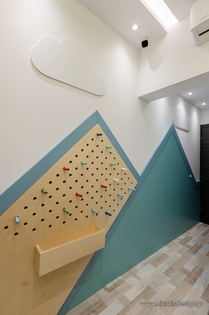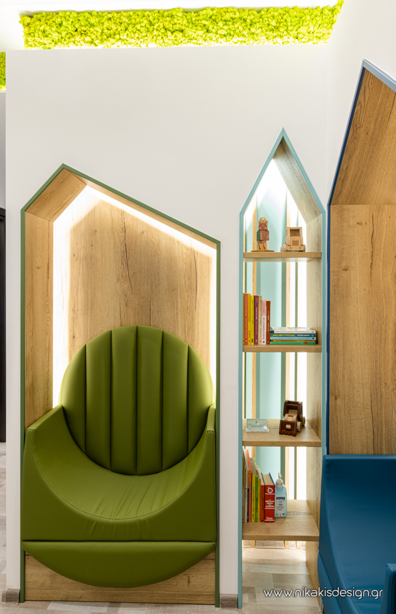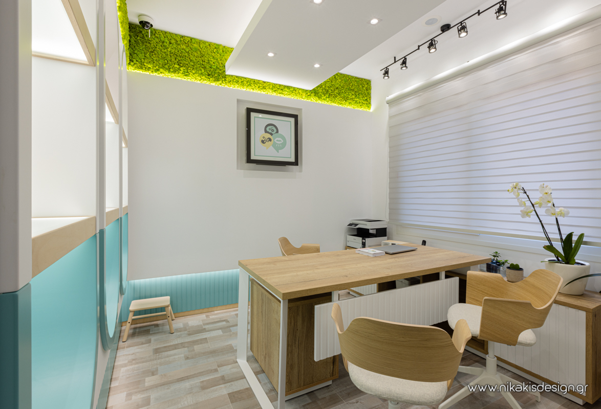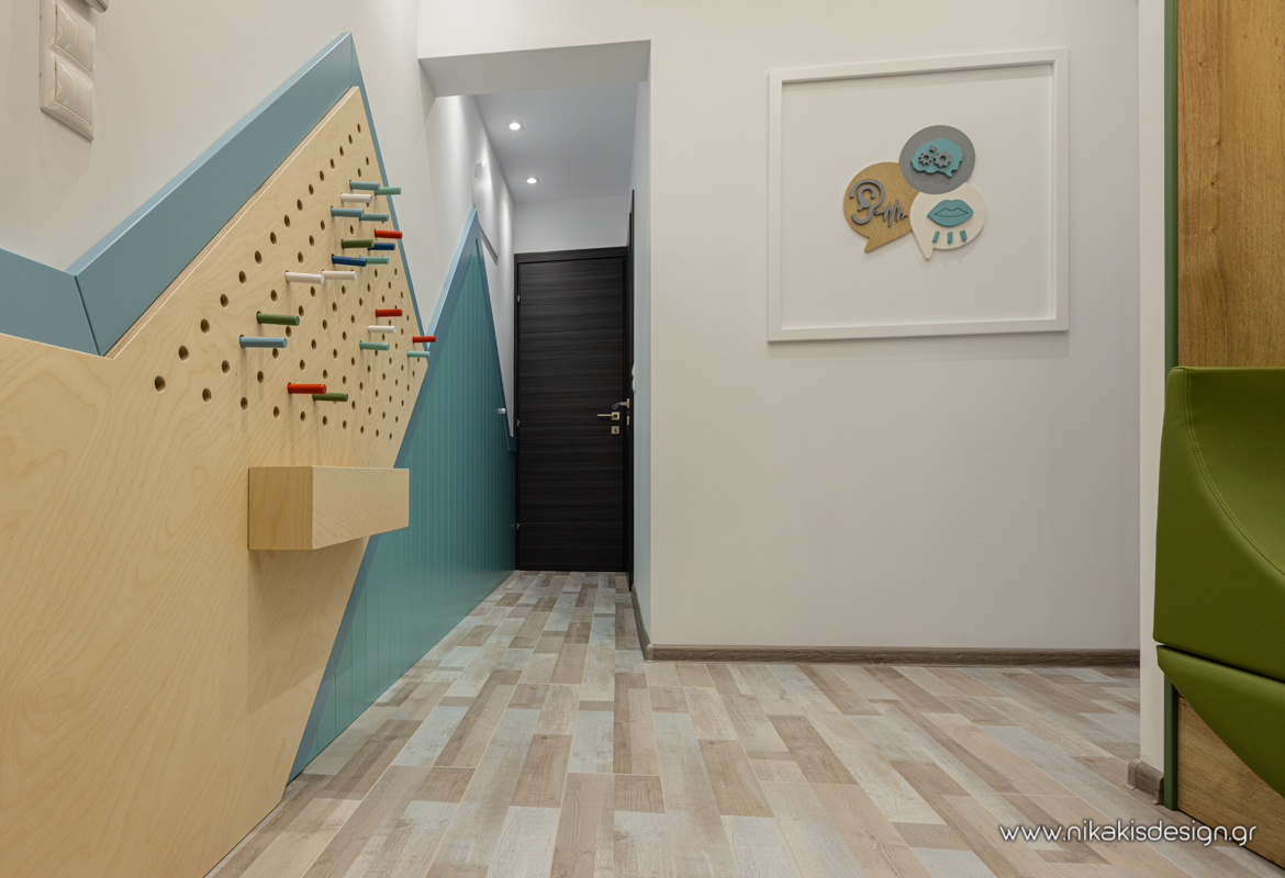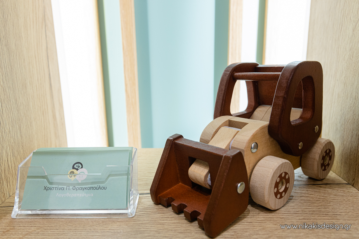 Περιγραφή: Το Κέντρο Λογοθεραπείας Φραγκοπούλου Χριστίνα είναι ένα από τα πιο πρόσφατα project μας στην πόλη της Κομοτηνής. Ο χώρος σχεδιάστηκε με γνώμονα το κοινό των μικρών επισκεπτών που επρόκειτο να φιλοξενήσει, ώστε να είναι ευχάριστος και διασκεδαστικός. Έτσι επιλέχθηκε το λευκό ως ο βασικός καμβάς, πάνω στον οποίο χρησιμοποιήθηκε το ξύλο στη φυσική του απόχρωση αλλά και σε επιλεγμένους φωτεινούς χρωματισμούς. Η χρήση μορφών σπιτιών, βουνών και σύννεφων και η παρουσία κατακόρυφων φυτών εξάπτουν την παιδική φαντασία συμβάλλοντας έτσι στην ευχάριστη διαμονή των παιδιών στο χώρο. Τέλος οι πολλαπλές και ποικίλες πηγές φωτισμού τονίζουν τις λεπτομέρειες και δημιουργούν ένα φωτεινό περιβάλλον.