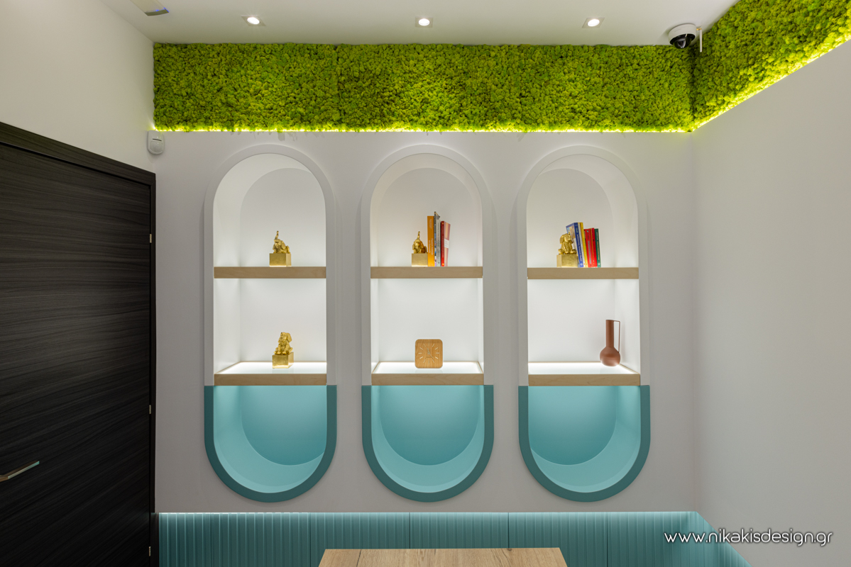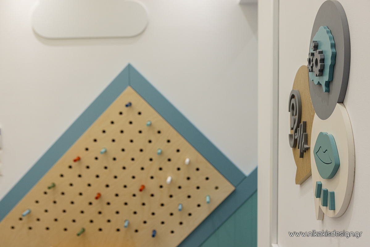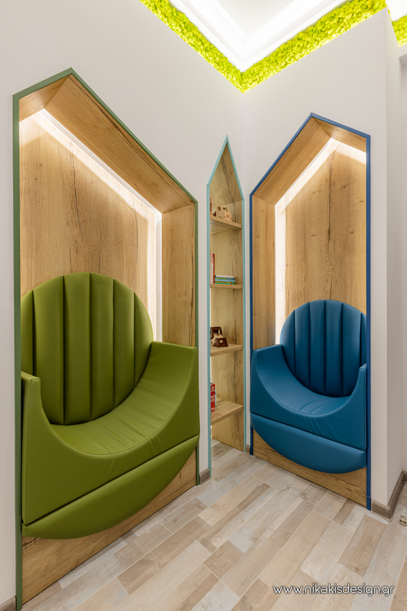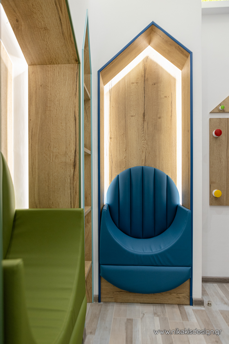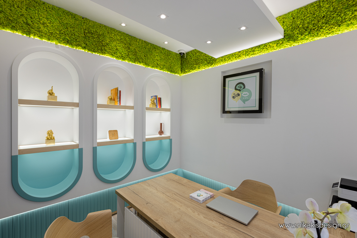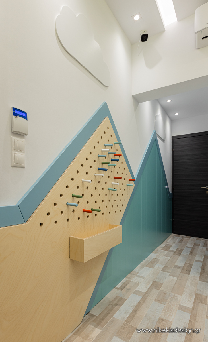 Περιγραφή: Το Κέντρο Λογοθεραπείας Φραγκοπούλου Χριστίνα είναι ένα από τα πιο πρόσφατα project μας στην πόλη της Κομοτηνής. Ο χώρος σχεδιάστηκε με γνώμονα το κοινό των μικρών επισκεπτών που επρόκειτο να φιλοξενήσει, ώστε να είναι ευχάριστος και διασκεδαστικός. Έτσι επιλέχθηκε το λευκό ως ο βασικός καμβάς, πάνω στον οποίο χρησιμοποιήθηκε το ξύλο στη φυσική του απόχρωση αλλά και σε επιλεγμένους φωτεινούς χρωματισμούς. Η χρήση μορφών σπιτιών, βουνών και σύννεφων και η παρουσία κατακόρυφων φυτών εξάπτουν την παιδική φαντασία συμβάλλοντας έτσι στην ευχάριστη διαμονή των παιδιών στο χώρο. Τέλος οι πολλαπλές και ποικίλες πηγές φωτισμού τονίζουν τις λεπτομέρειες και δημιουργούν ένα φωτεινό περιβάλλον.